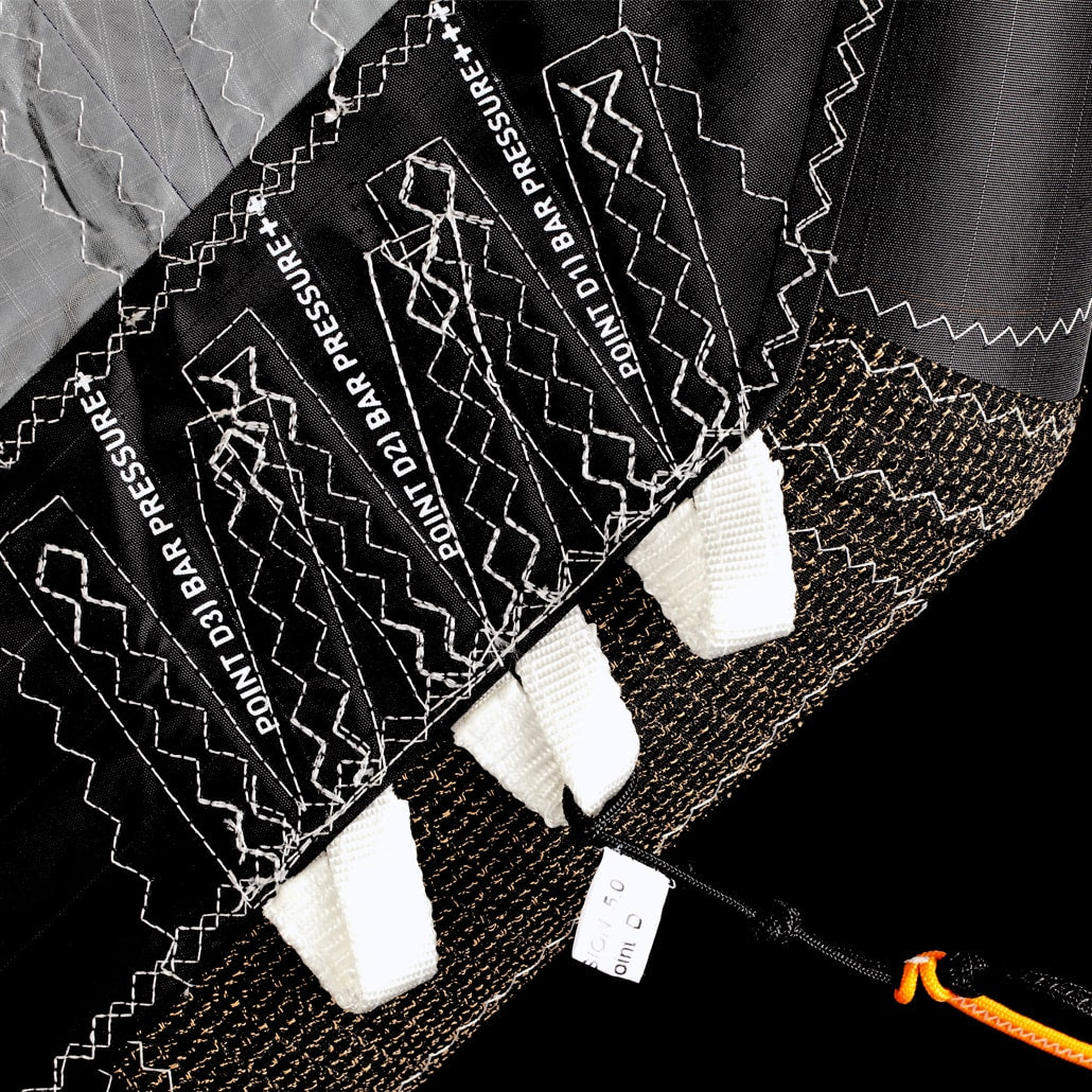 In correspondence of each strut and it’s connection point onto the leading edge, we have created a specific 45° crossed fibers double ripstop reinforcement that spreads the load of the strut onto the body of the kite during hard crashes, drastically reducing the potential canopy breakage of the kite.