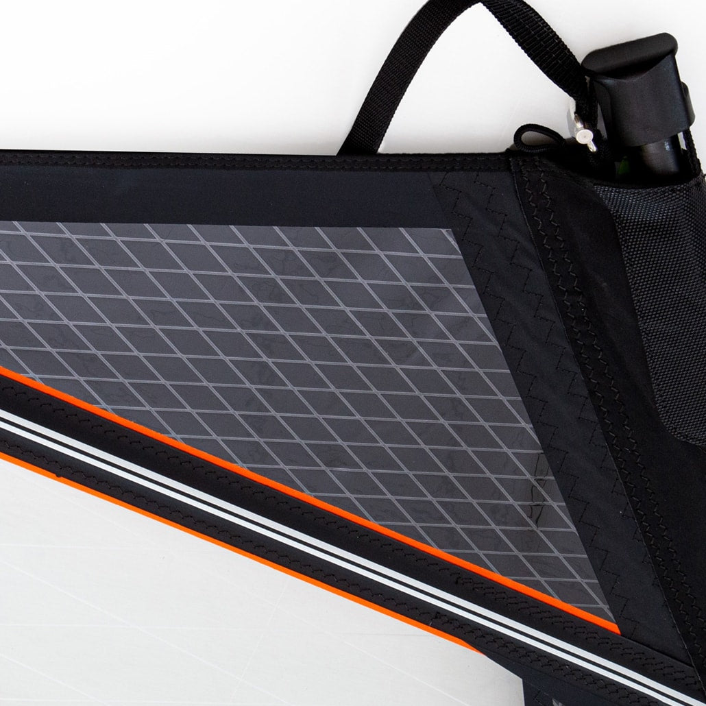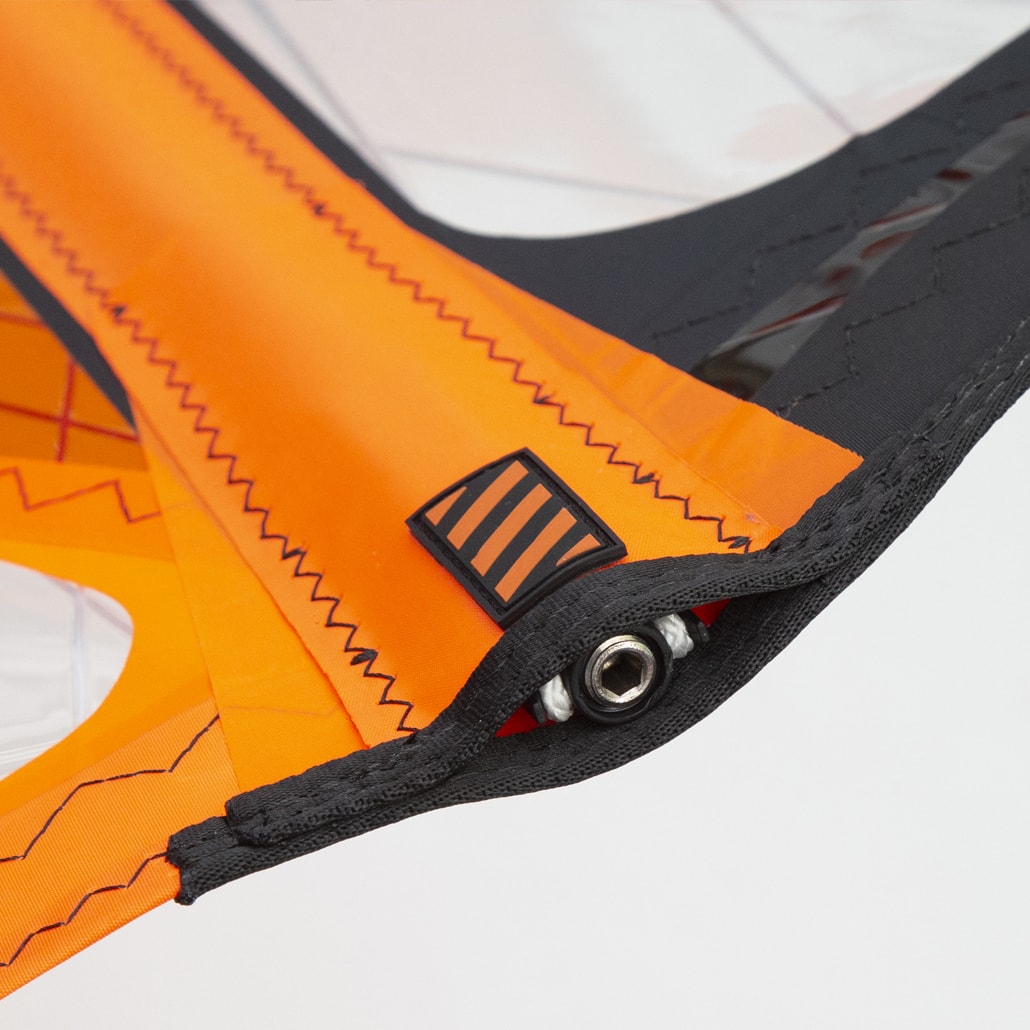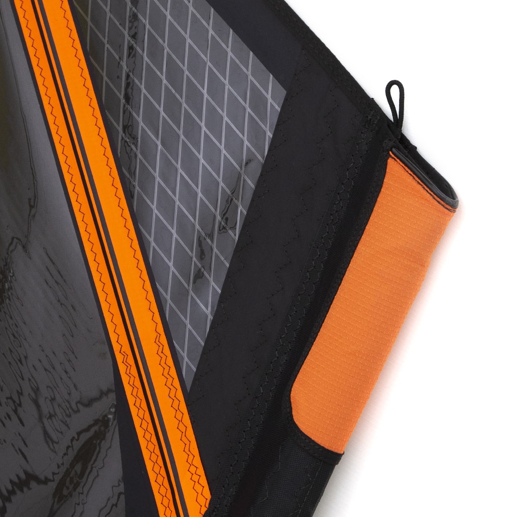 Reinforcement patch extends into the main window to spread the loads across multiple sail panels for increased durability.