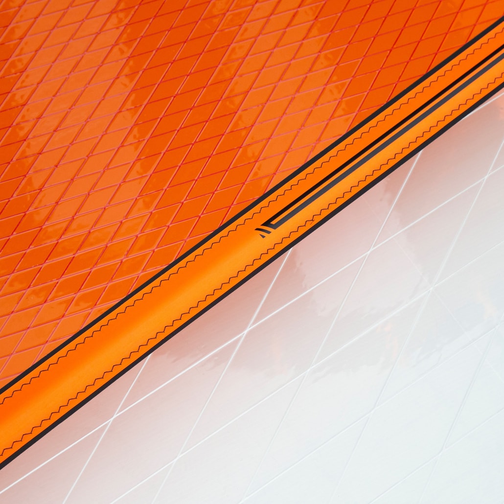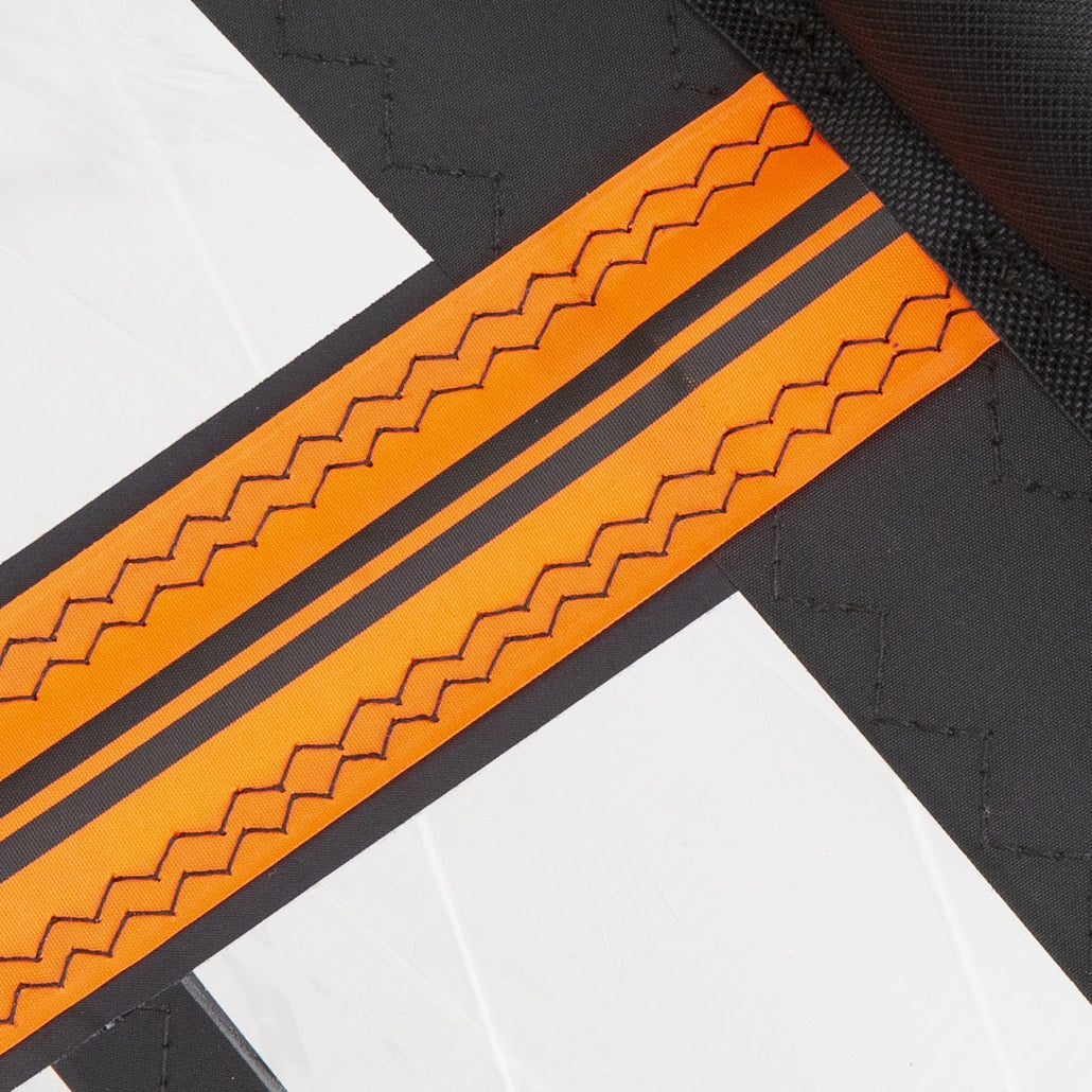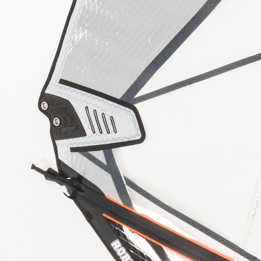 Reinforcement patch extends into the main window to spread the loads across multiple sail panels for increased durability.