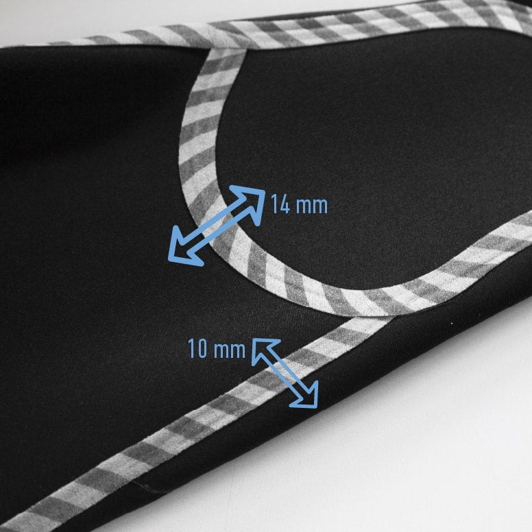 Some areas are very sensitive to friction, tension and tearing that’s why we used two different tape width, 14 mm for crotch HI-stressed area and 10 mm for the rest of the panels. This intelligent positioning of materials allows saving weight and keeping the right elasticity and strength.