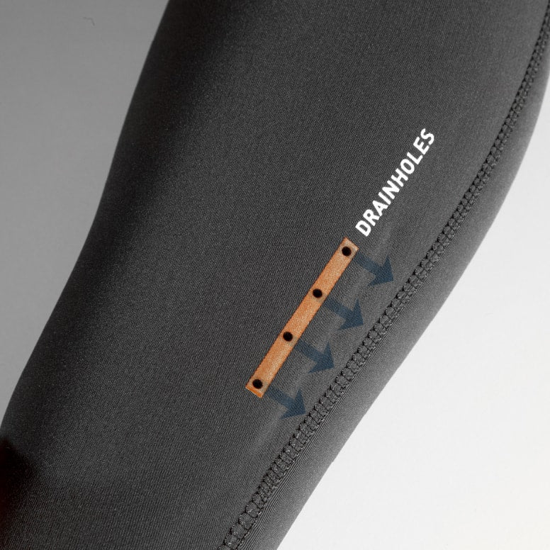 No more elephant legs after spray from your board splashed into your suit through the legs. The water just drains back out, so you can keep riding without having to adjust your leg cuffs or let any water out.