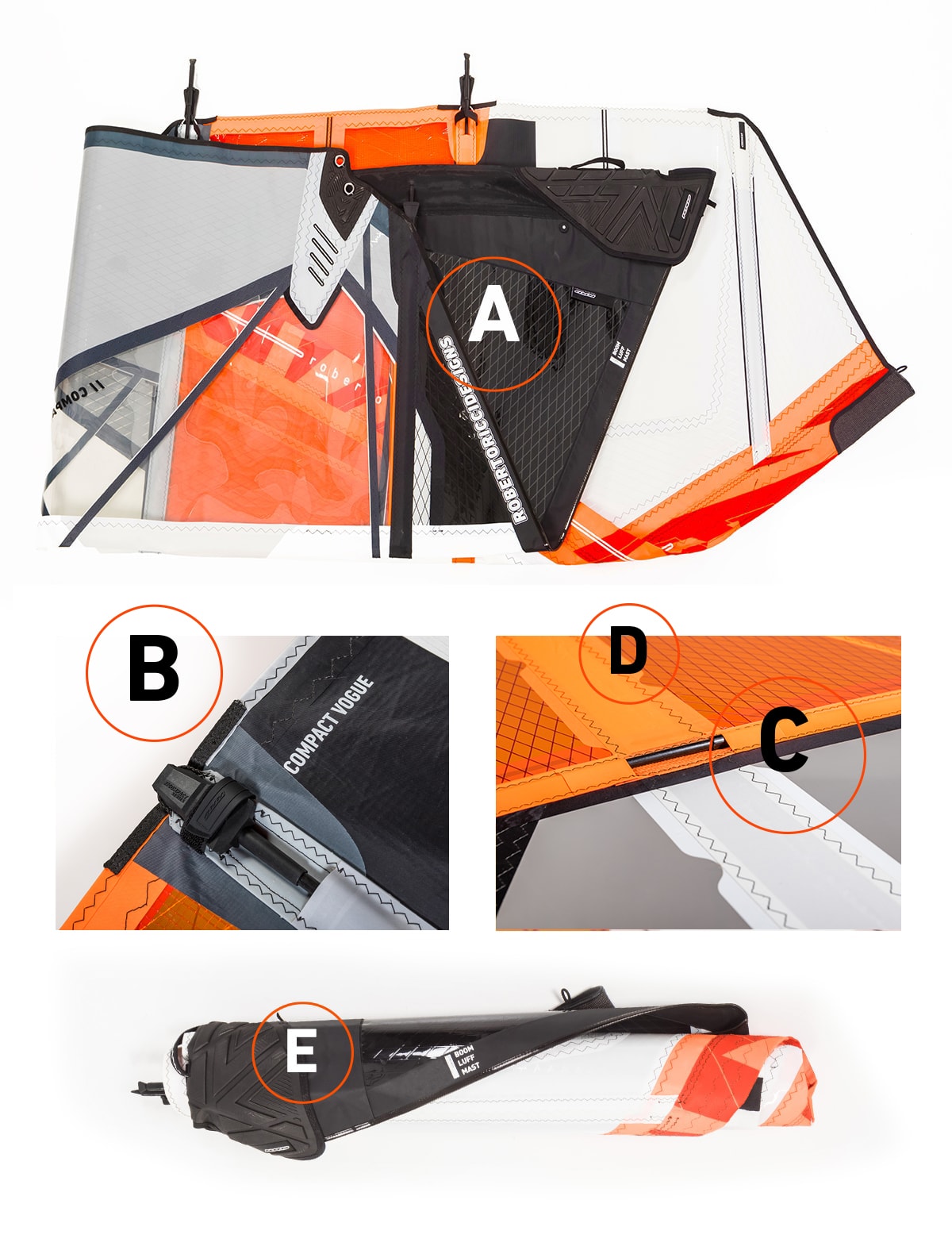 The sails are carefully designed to fold in half for ultra portability (A). Our unique batten system allows quick release of the tension (B) and a split in the centre allows for easy folding (C). A Dacron strip running now the middle of the sail gives a heavy duty folding section (D), allowing the sail to fold and roll and pack up half the size (E). Each backpack can fit up to 3 sails inside.