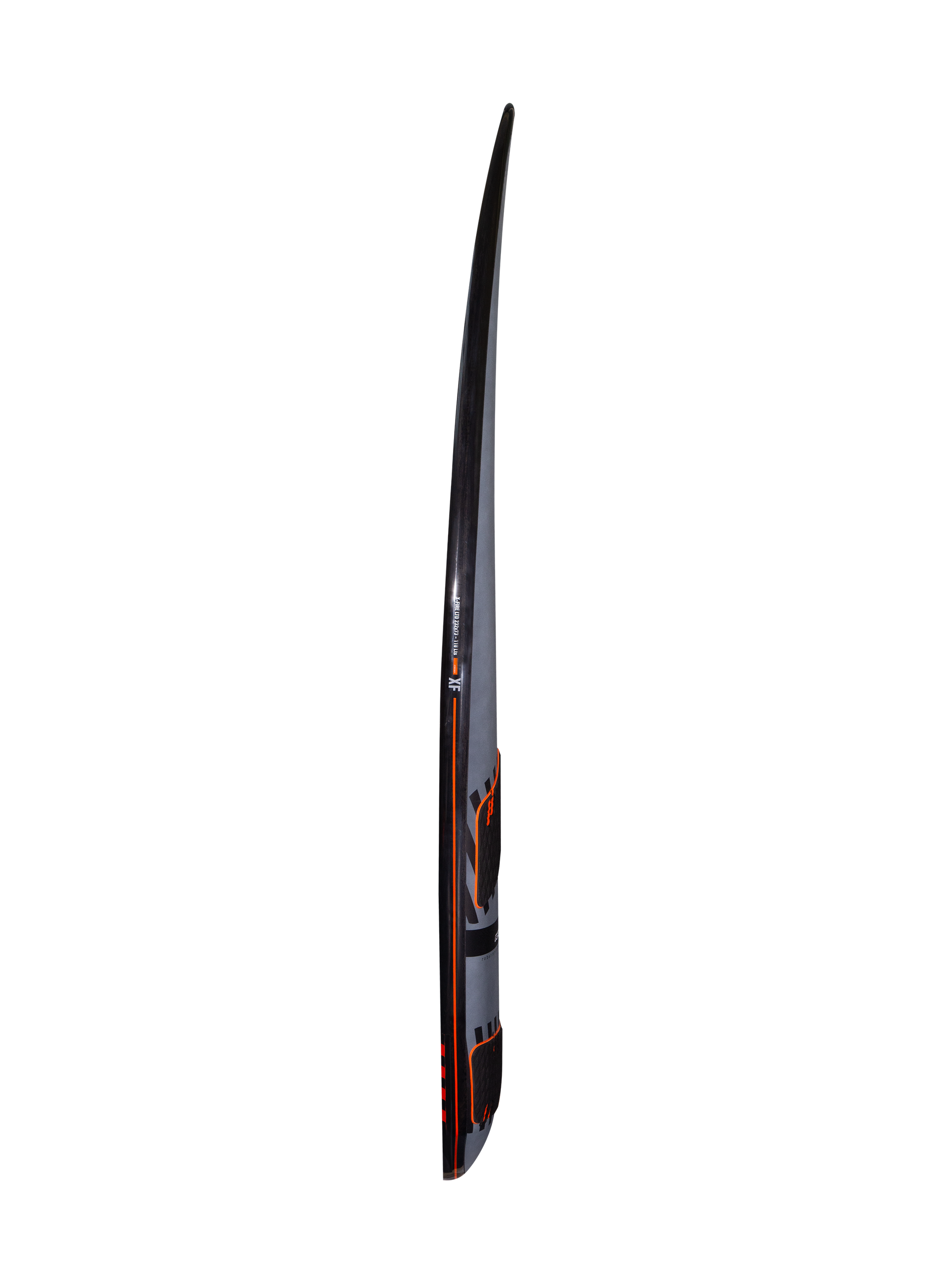 Entirely built with a completely new 100 grms /sqmt Biaxial super light carbon fibers both on deck and bottom. The lightest yet reliable layup construction ever developed on a racing machine! NEW, re-designed shapes enhancing control in overpowered situations, allow earlier planing, smoother gliding, and quickly accelerating after jibes . Needs anything else? The refined slalom scoop-rocker line ensures streamlined handling, bursting acceleration, and top speeds on any water surface. The deep deck concave configuration delivers lower sail foot placement , increasing stability after gybing and improving planing and acceleration post-mark. The marked Vee bottom and double concave setup in the nose for over the chop clearance and a seamless ride. Changing to reduced vee and concavity towards the tail minimizing wetted surface area for ultra-high top speeds and rapid but continuous acceleration.
